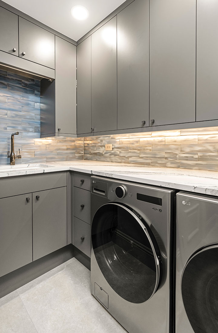 In the laundry room, we kept the original layout but added a hanging rod above the sink for easy clothes drying. We updated the space with new countertops over the washer and dryer, fresh semi-custom cabinetry, and a clean tile backsplash to give it a more modern, transitional look.